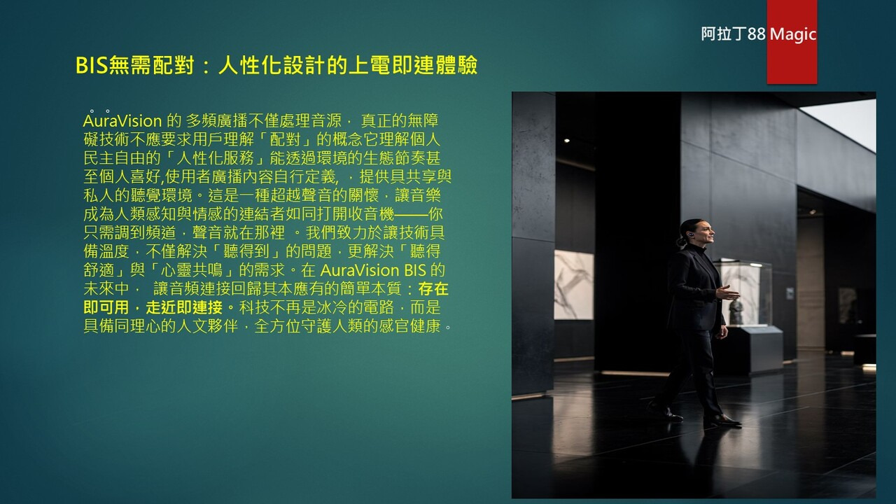 4.國際專利護航:創新世界技術,首創AuracastBIS廣播LC3技術,免配對開電自動連結,無限數量同步收聽,立即享受。