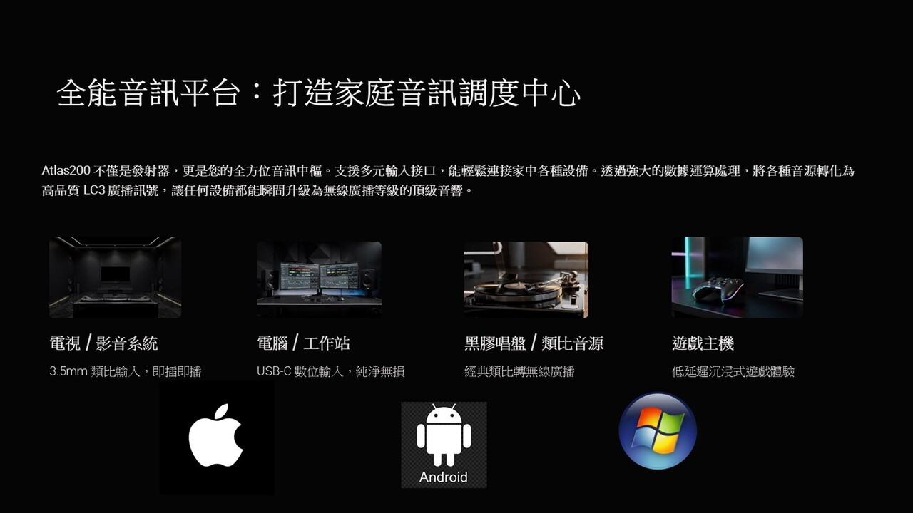 3.耳機輸出介面: LC3 廣播音樂,無線藍芽音樂,USB 2.0 串流音訊(無損音質)。