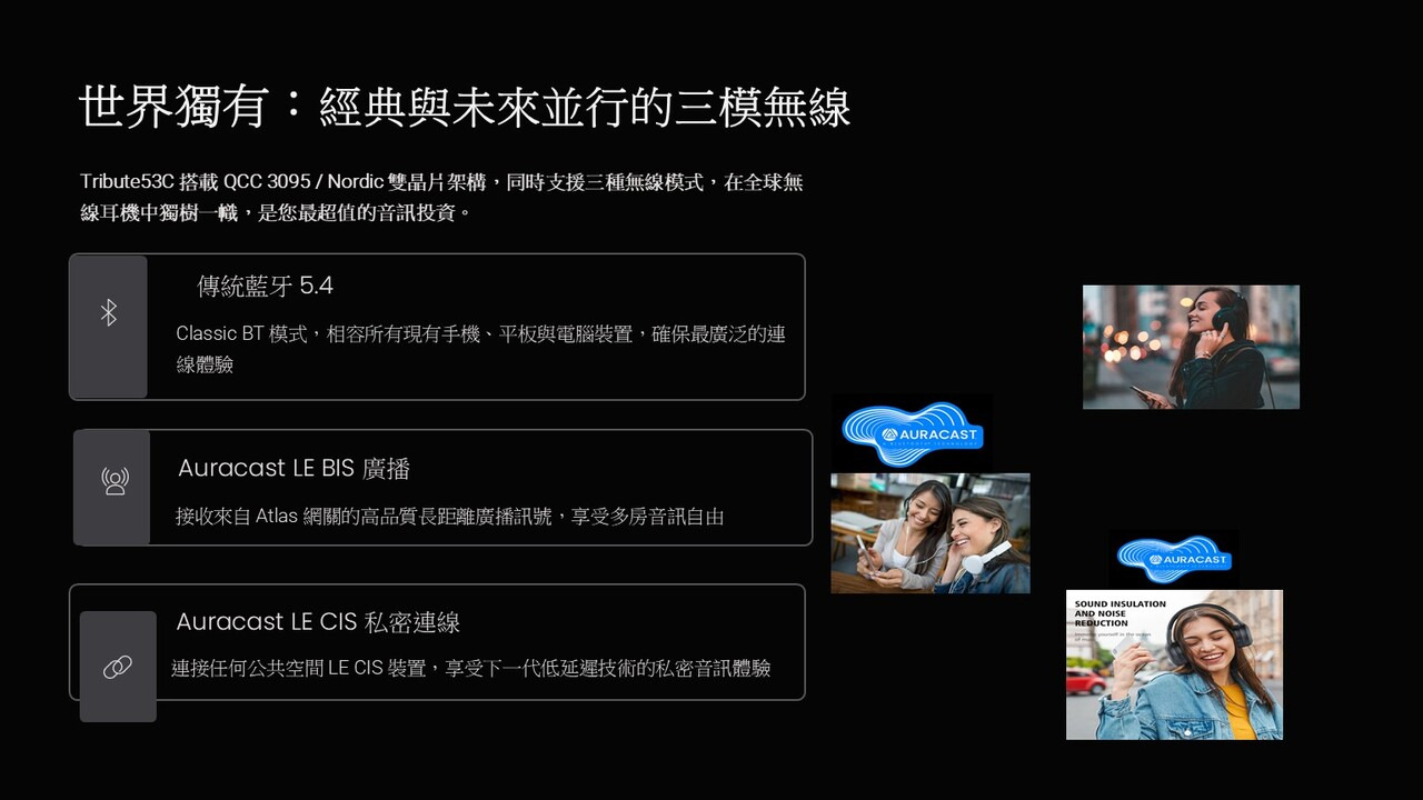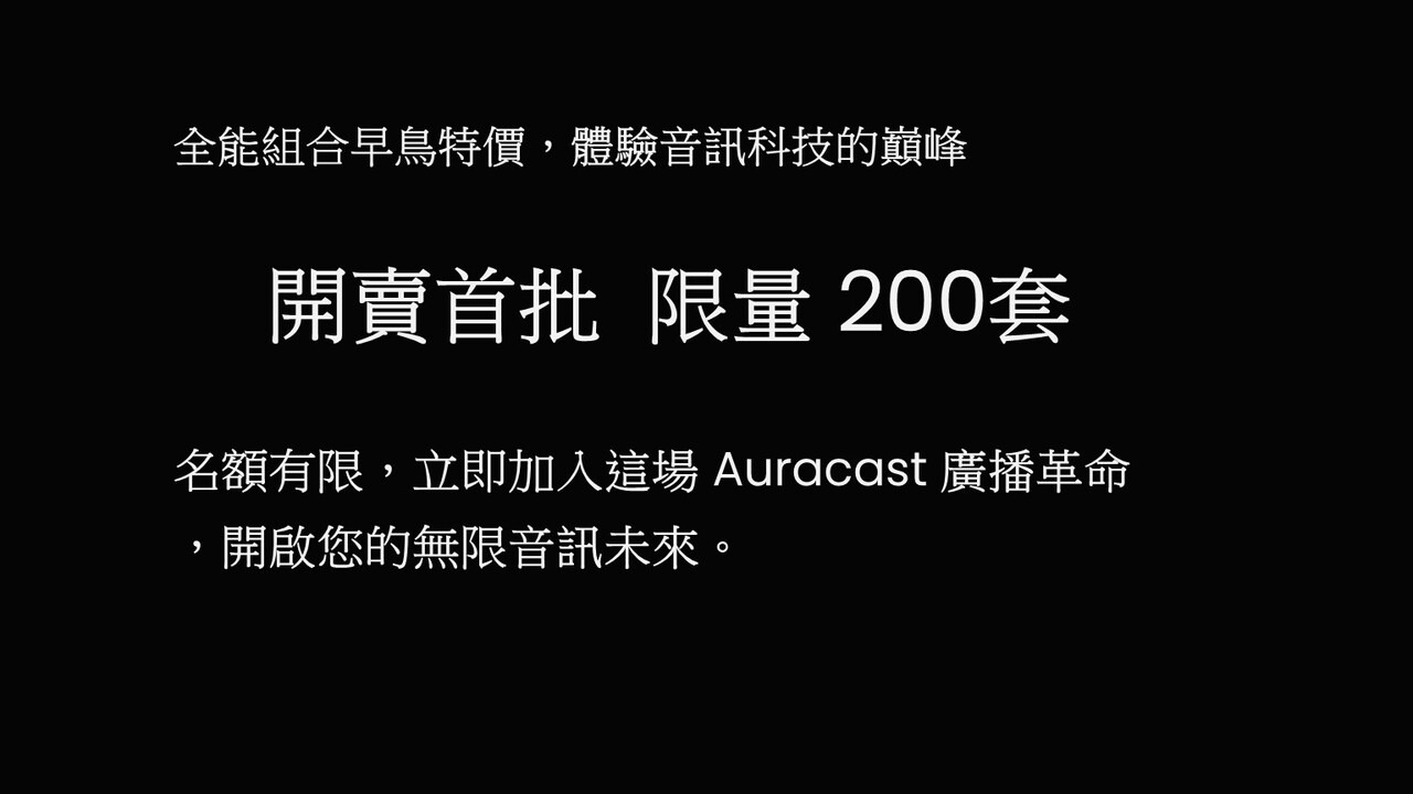 4.國際專利護航:創新世界技術,首創AuracastBIS廣播LC3技術,免配對開電自動連結,無限數量同步收聽,立即享受。